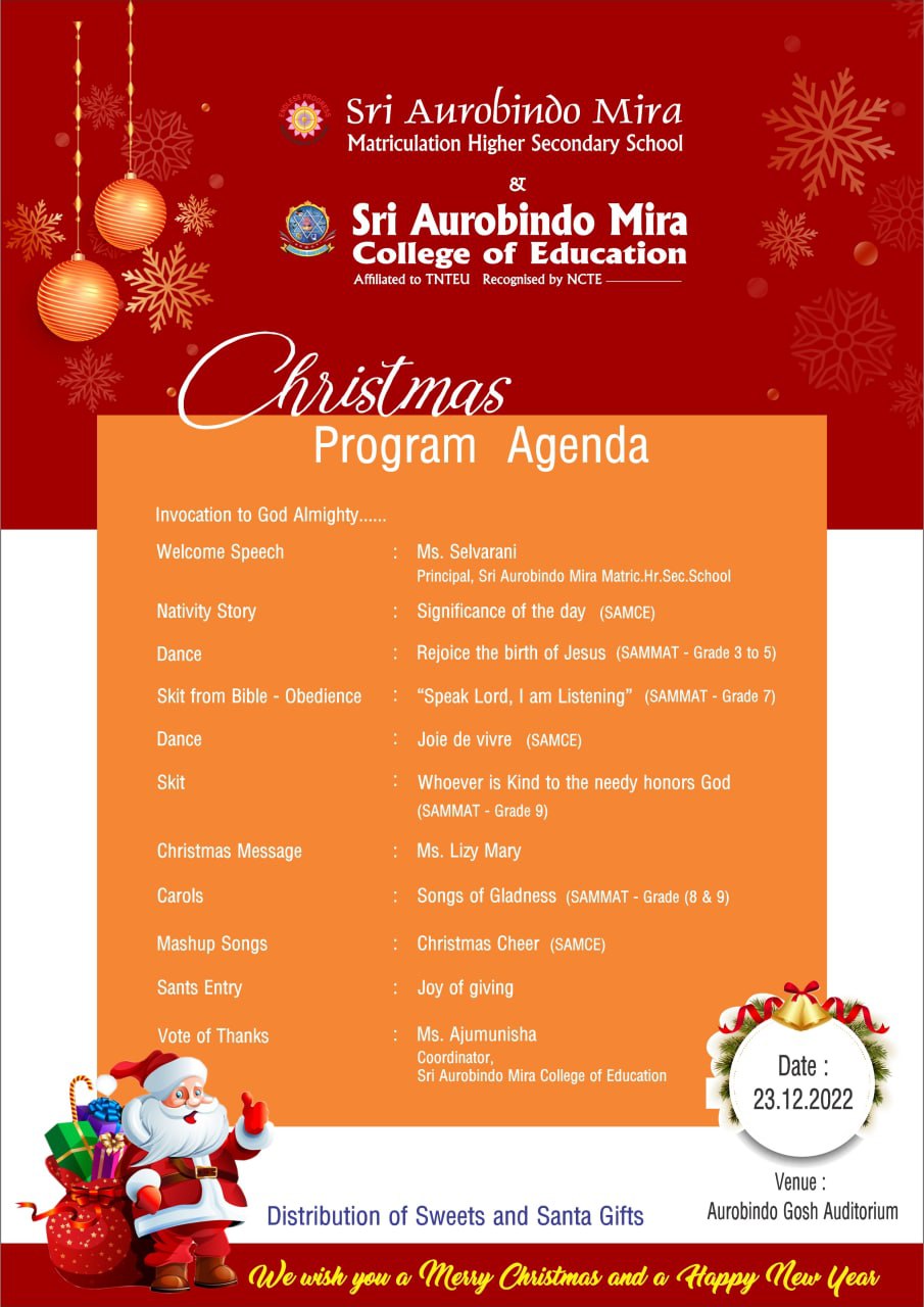 Christmas is more than a festival or season. Christmas is a feeling. A feeling of joy and togetherness which is why it is celebrated all over the world in the winter season to spread the warmth of love and compassion. Though we don’t see actual snow here, the pureness of white is certainly seen around in the happy faces of our loved ones. To celebrate this pureness and happiness, a programme was organised for the students and faculty of SAM group of educational institutions. Students from all the institutions rocked the stage with their wonderful performances in the cultural programme. The first year and second year student teachers of SAMCE, together, gave 3 performances. Around 20 students came together and made the stage shine with their acting skills performing a skit depicting the nativity scene, the birth of Jesus Christ after around a month of practice. Another group of 8 girls rocked the stage with their dancing skills performing for different upbeat English and Tamil carols. Lastly, a group of 10 students-6 girls and 4 boys performed a mash up of Christmas carols that stole the entire show. Because Christmas is a season of giving and sharing, gifts were exchanged among students to show the love and appreciation they have for each other. Christmas cake was then distributed to all students and faculty by the coordinator Ms. Ajumunisha and Physical director Mr. Sivabalan, because everything feels double special with cake and sweets. Though Christmas is widely celebrated by the people who follow Christianity, the concept of any celebration is first and foremost to spread togetherness. To end the celebration with a proper bang, a small not-so-authentic DJ was organised in the multipurpose hall of SAMCE for the SAMGTRANS family where they could let loose and go wild. Though we officially celebrate Christmas on the 25th of December annually, Christmas will always be as long as we stand heart to heart and hand to hand because as we have already established, Christmas is not just a season. Christmas is a feeling.