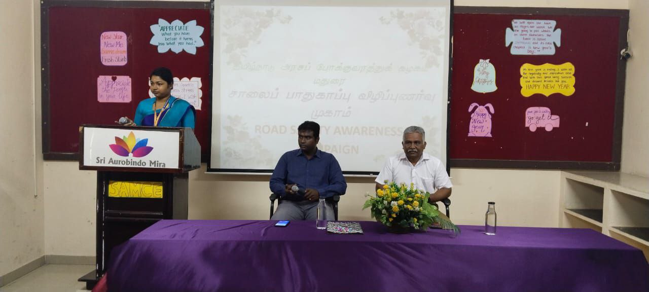 To create awareness regarding road safety rules and tricks, Sri Aurobindo Mira College of Education organised a guest lecture on “Humanity on Road” in the presence of Mr. J. Bharath Silvestar, Dean of SAM group of educational institutions. Our eloquent chief guest Mr.Narasimma Mani, chairman of Driving Needs Academy and Mr. John Wesly, trainer and instructor at TNSTC driving school addressed the audience of 1st and 2nd year B.ED students on how important it is to be fully present while on the road. A lot of videos were shown to the audience to make them realise the reality of the situations on the road today. The entire session was emotional and educational. It showcased how a small mistake could be fatal to us and others when you’re on road. It showed how and why being careful is crucial. Students got to know new interesting information about Road signs and symbols from the session after which aQ&A session was organised for them. Mr. Narasimma Mani and Mr. John Wesley answered all the questions in a very precise and clear manner.Let’s follow them and take care of each other. Let’s remember that a fast drive could always be our last drive.