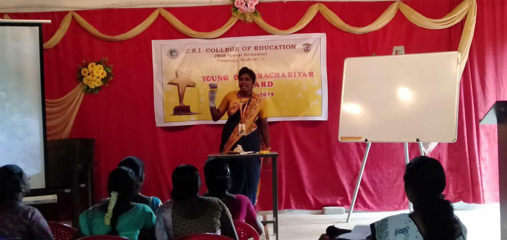 In order to Sharpen the teaching Skills of the Young Student teachers “Young Dronacharya Award” competition was organized by C.S.I.College of Education, Pasumalai, Madurai. The competition was conducted in Teaching performance, TLM Exhibition and Powerpoint presentation .Four student teachers from our institution participated and proved their teaching competency in various skills. Ms.Angel jeeva selva won the Young Dronacharya Award.