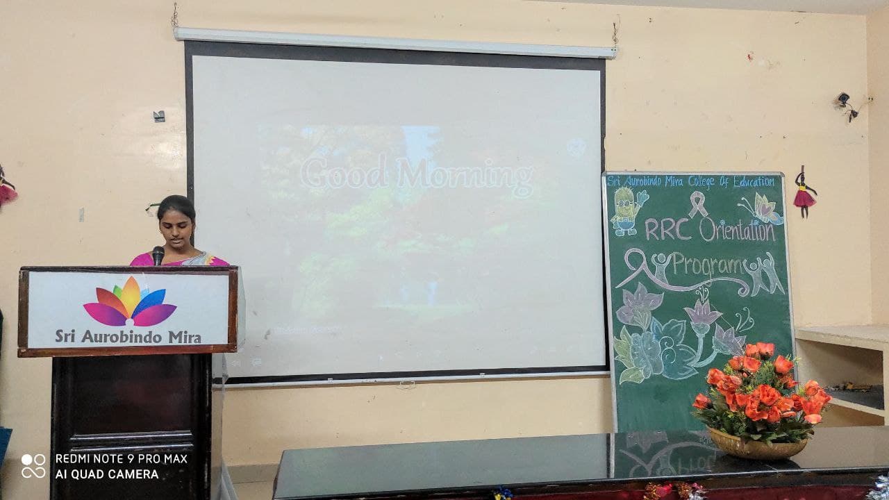 Sri Aurobindo Mira College of Education organized an Orientation programme on 27th September 2021 for the I year student teachers. The programme commenced with our divine Annai Song followed by the welcome speech by the student teacher MS.Harwintha and Mr.Anas, President of RRC recited the pledge. 1st year B.ED students were introduced to the Red Ribbon club with a promo video compiling the annual report of the previous year which inspired all of us to get involved in the upcoming social activities that enables growth and development. Investiture ceremony was held for newly elected President Mr.Guru , Vice President Ms.B.Priyadharshni , Secretary Mrs.Anupriya and the volunteers Jenifer and Divya were honoured with a flower bouquet. Later feedback session gave us the idea about the functioning of the RRC club followed by the felicitation address by our beloved Ms.Ajumunisha ma’am, Her words gave us more motivation and enthusiasm, words of Dr.Mr.Sivabalan sir was totally optimistic. Finally, Ms.Sivasathya concluded the programme with the vote of thanks. The orientation as a whole was very valuable and encouraging and save an insight into expectations of RRC club. The red ribbon batch which was circulated among the student teachers gave us the pride of holding a responsibility to oneself. It’s a pride of an individual citizen to embrace the National Anthem, which was song at the end of the program.