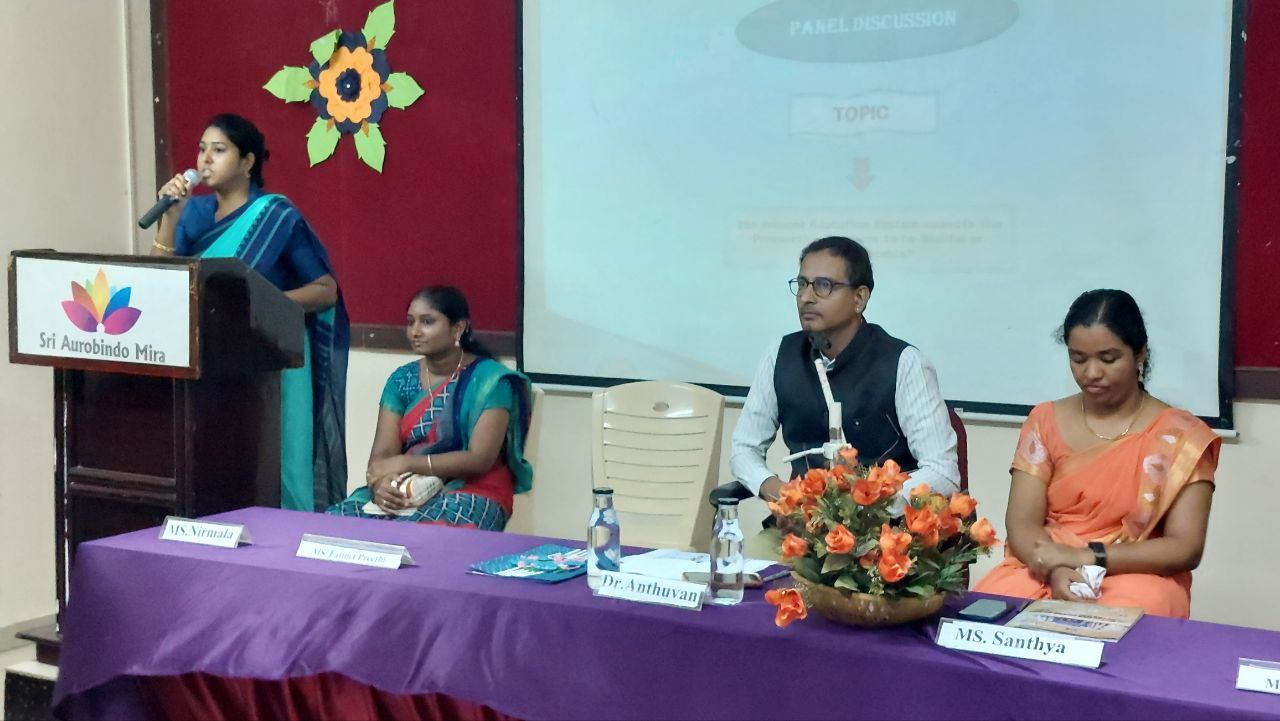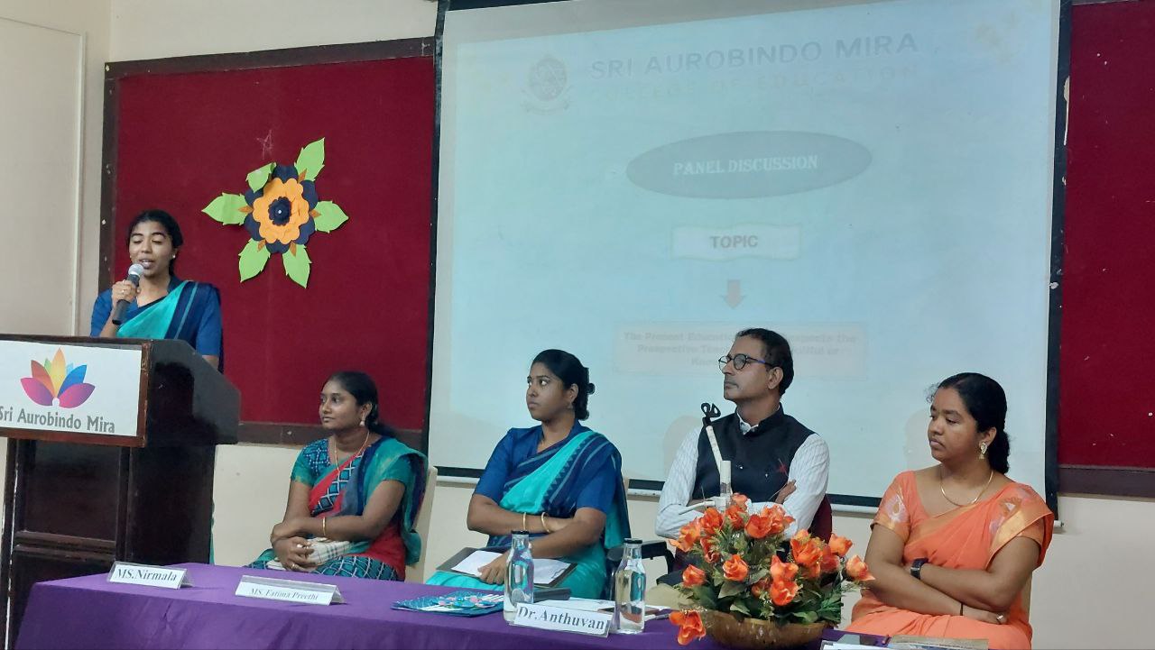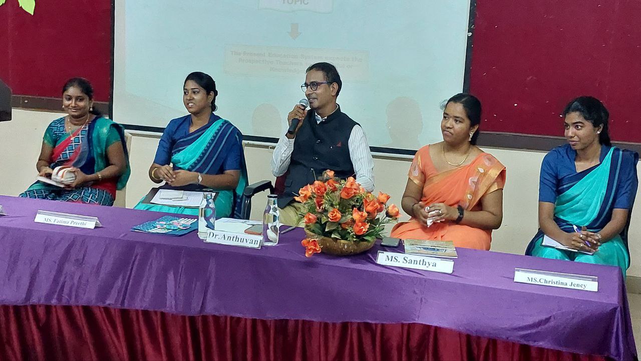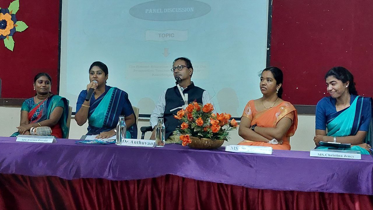 To make the future teachers of SAMCE aware of the role their opinions hold in this society and the field of education, and to make them get a peek into the lives of teachers, a panel discussion was conducted in the SAMCE campus on the topic “The education system needs the prospective teachers to be more knowledgeable or skilful”. A panel with 4 members- 2 staff members from SAM Matric, also alumni of SAMCE and 2 1st year student teachers of SAMCE batch 2022-2024 tool to the stage to state their opinions in their desired topics. Mr. Anthuvan Gabriel, principal of Aurobana Indian School served as the moderator for today’s session. Compelling and convincing arguments, if they can be called so, we’re made by ask the panelists on whatever they were speaking for. The chairman of the SAM group of Educational Institutions, Mr. Chandran graced the event with his presence and delivered the felicitation address. The way he spoke about the New Education Policy and the requirements of a teacher to be more skilful and knowledgeable to survive in the field of education was really fantastic. Knowledge and skills are different yet, they are codependent. One simply cannot exist without the scaffolding of the other. This message was clearly given to the future teachers and present teachers of SAMTRAN family as teachers play a vital role in the shaping of the society and knowledge and skills play a pivotal role in their teaching learning process.
